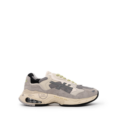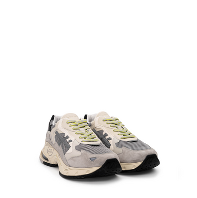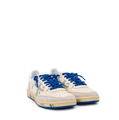 Leather sneakers in white with silver details from Premiata. A round toe, lace-up closure. A mix of leather, suede and mesh textile. Leather lining...
