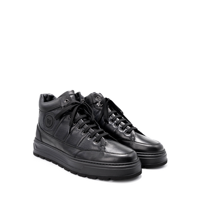 It fits large to size; take a size smaller than usual. Grained leather sneakers in black from Giampieronicola. A round-toe, lace-up closure, zip cl...