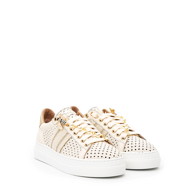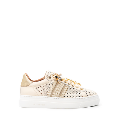 Leather sneakers in beige with silver and golden details from Stokton. A round toe, lace-up closure. Leather lining. Rubber sole. Item Code: 44924 ...