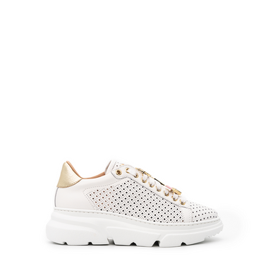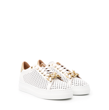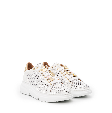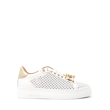 Perforated leather sneakers in white with gold detail from Stokton. Decorative embellishment. A round toe, lace-up closure. Leather lining. Rubber ...