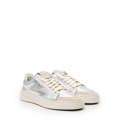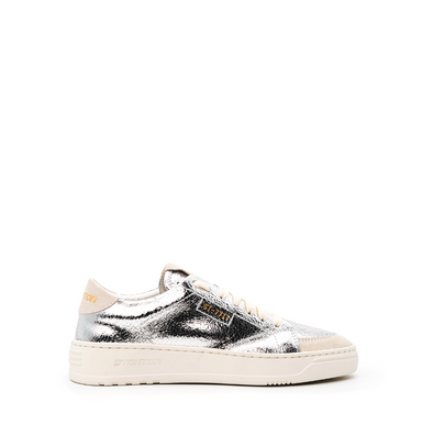 Embossed leather sneakers in silver from Stokton. A round toe, lace-up closure. Logo embossed at the back. Leather lining. Rubber sole. Item Code: ...