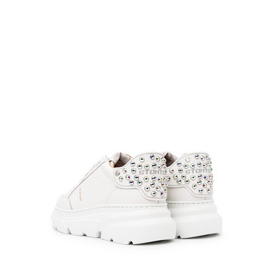 Leather sneakers in white from Stokton. A round toe, lace-up closure. Removable decorative detail. Leather lining. Rubber sole. Item Code: 4691 Mat...
