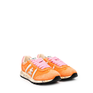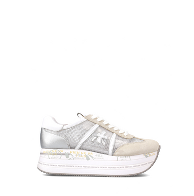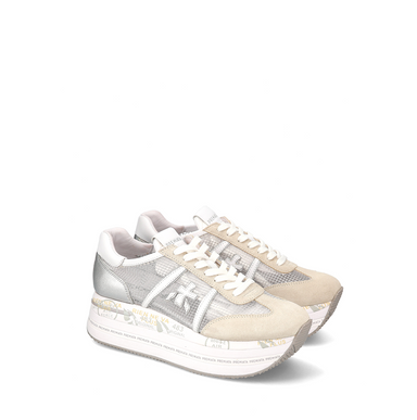 Suede and mesh textile sneakers in a light beige tone from Premiata. A round toe, lace-up closure. Holographic leather detail. Leather lining. Rubb...