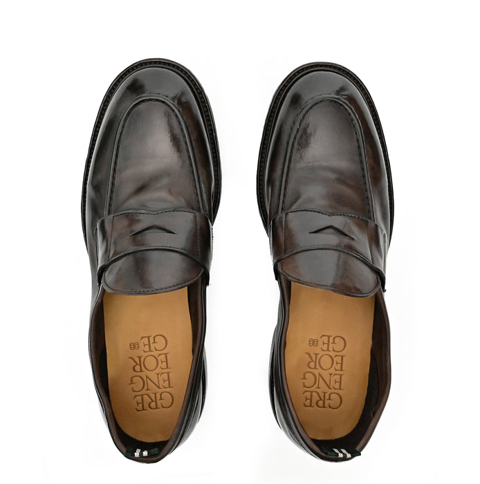 Handmade brown tone soft leather loafers from Green George. A round-toe, slip-on design. Pull loop at the heel part. Please note that these leather shoes are finished with a unique washing technique making each pair different and exclusive. Leather lining. Leather lining, leather/rubber sole.