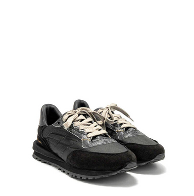All-black sneakers from Premiata are crafted from grained leather and suede. Rounded toe, tonal laces, soft leather lining, and branded insole. Sig...
