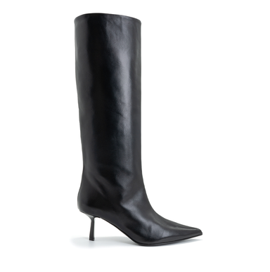 Black leather tall boots from Mattia Capezzani. Pointed toe, sleek high shaft. Leather lining, leather sole with rubber insert. Item Code: 5312 Mat...