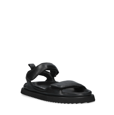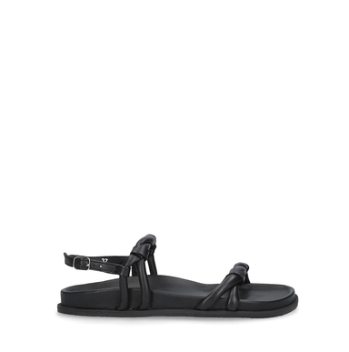 Leather sandals in black from Elena Iachi. A round toe, buckle closure. Many strings cover the foot, leaving uncovered the toe and heel. Leather li...