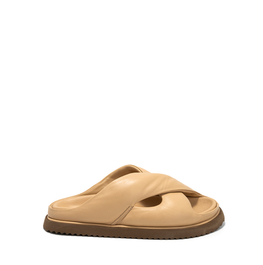 Light brown leather sandals from Fruit. A round-toe, slip-on design, pleated leather bands. Leather lining. Leather sole. Item Code: 9216 Materials...