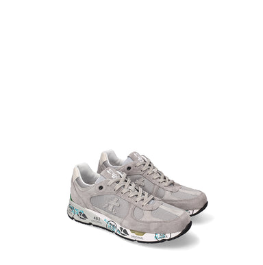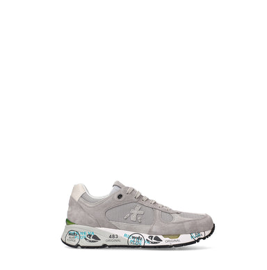 Suede and technical textile sneakers in grey with yellow leather detail from Premiata. A round toe, lace-up closure. Leather lining. Rubber sole. P...