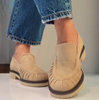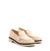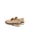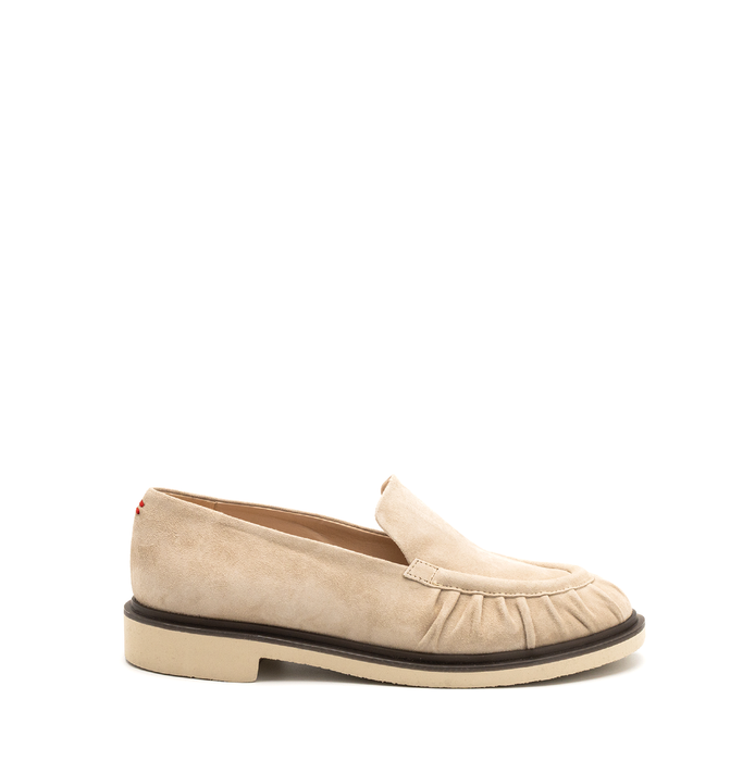 Light brown suede loafers from Halmanera. A round-toe, slip-on design. Pleat detailing. Leather lining. Rubber sole.