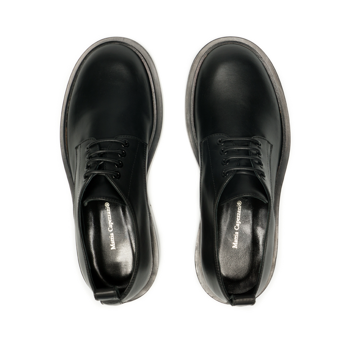 Lace-up leather shoes in black from Mattia Capezzani. Round toe, lace-up closure. These shoes are finished with a special dyeing and washing technique, making each pair different and exclusive. Leather lining. Leather/rubber sole.