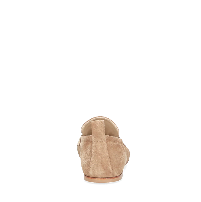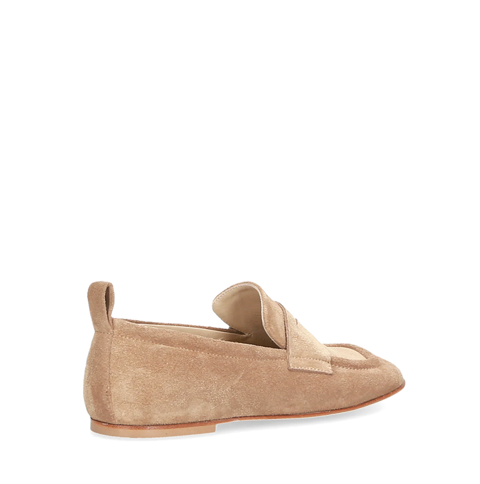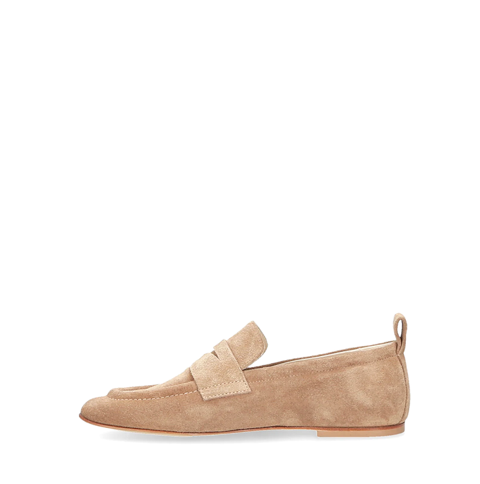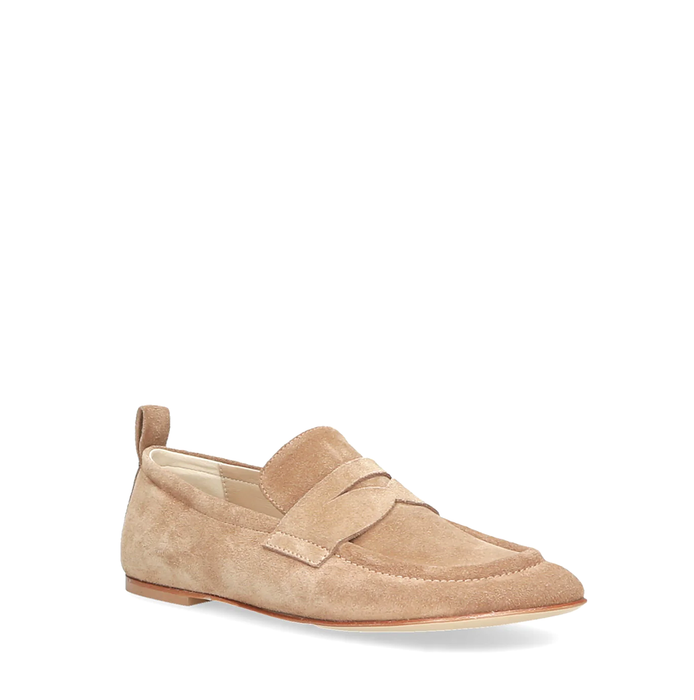 Suede loafers in light brown from Elena Iachi. A round-curved toe, slip-on design. These leather shoes are finished with a unique washing technique, making each pair different and exclusive. Leather lining. Leather sole.