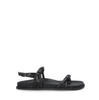 Soft braided leather minimalist sandals in black tone from Elena Iachi. A round-toe, slip-on design, buckle closure. Leather lining. Rubber sole.