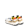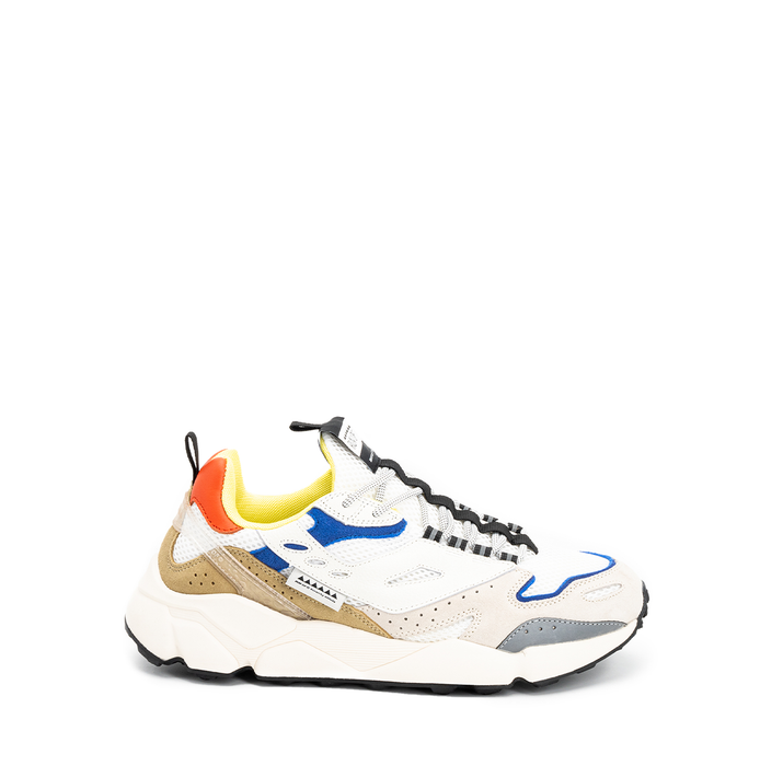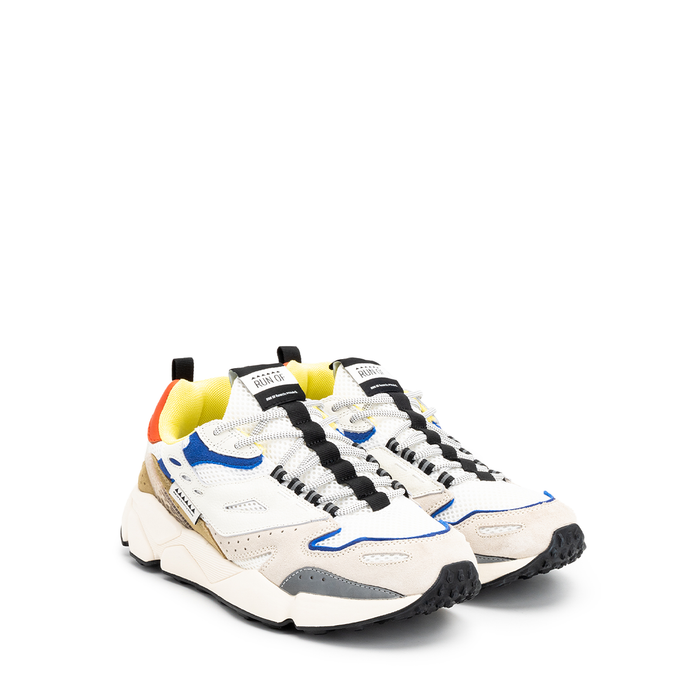 Viršus - rusvos spalvos atspalvių versta oda, baltos spalvos tinklelinė tekstilė. Suvarstomi. Su mėlynos ir baltos spalvų detalėmis.