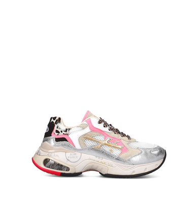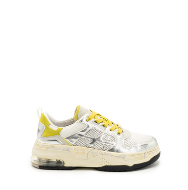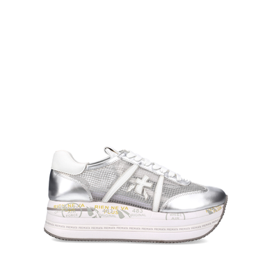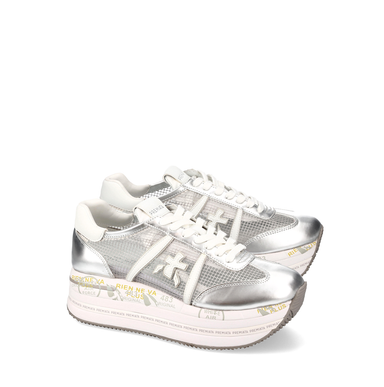 Balti sportinio tipo bateliai iš odos ir blizgios sidabrinės tekstilės. Suvarstomi, viduje - oda, padas - guminis. Importuota. Prekės kodas - 7756
