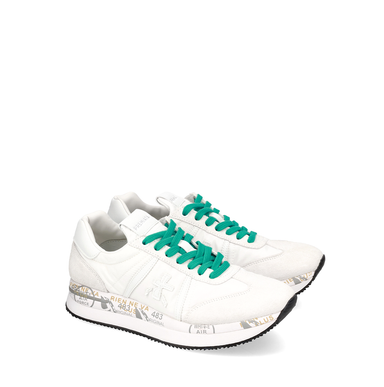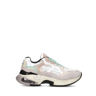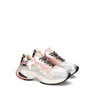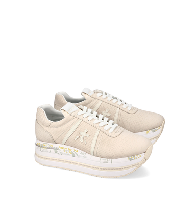 Kreminės spalvos sportinio tipo bateliai. Verstos odos ir nailono derinys su rudos spalvos užkulnio detale bei gyvūnų rašto detalėmis. Suvarstomi. ...