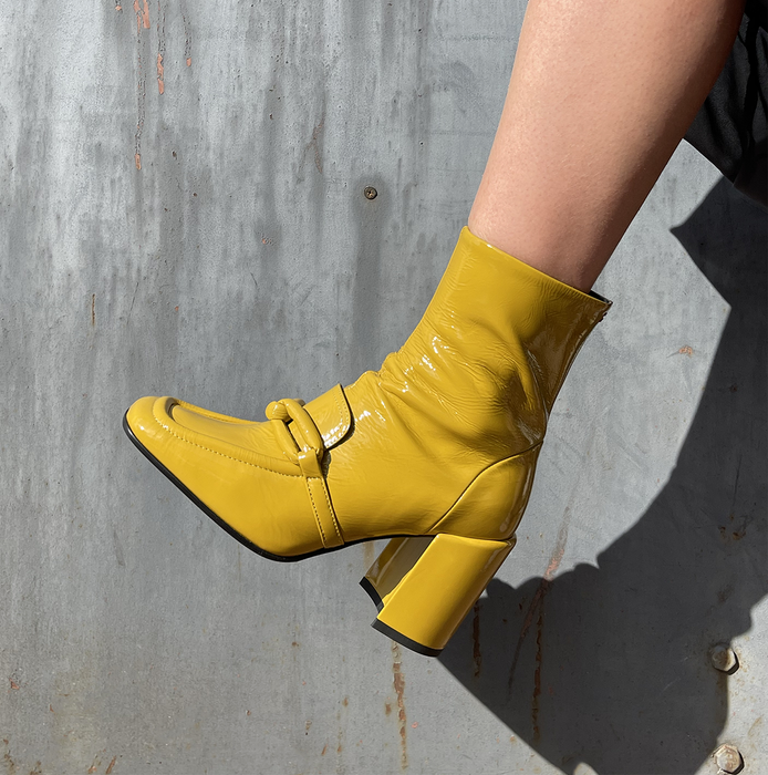 Viršus - minkšta lakuota oda. Užsegimas užtrauktuku vidinėje dalyje.