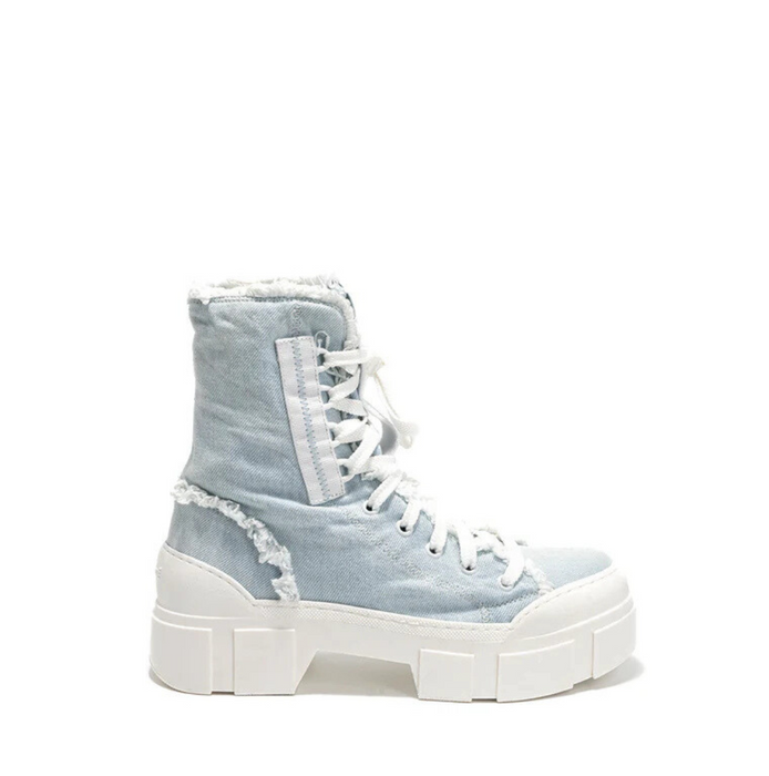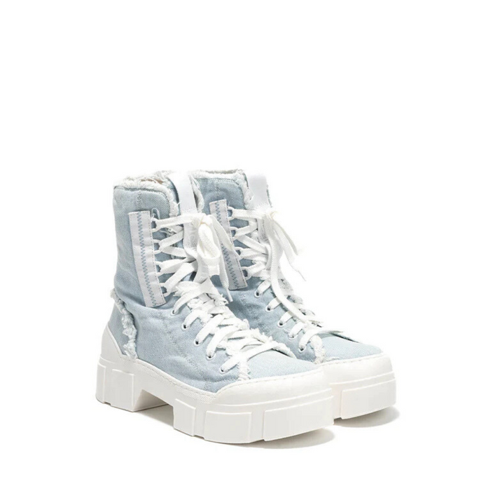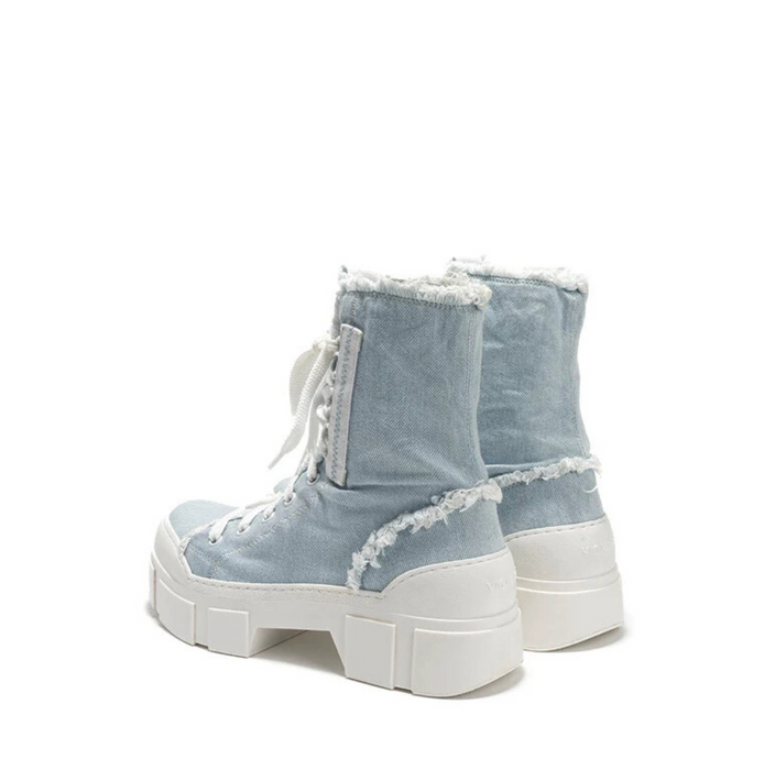 Viršus - sendinto, plėšyto efekto šviesus denimas, kuris sendintas specialiu būdu, taip suteikiant kiekvienai porai unikalumo. Suvarstomi.