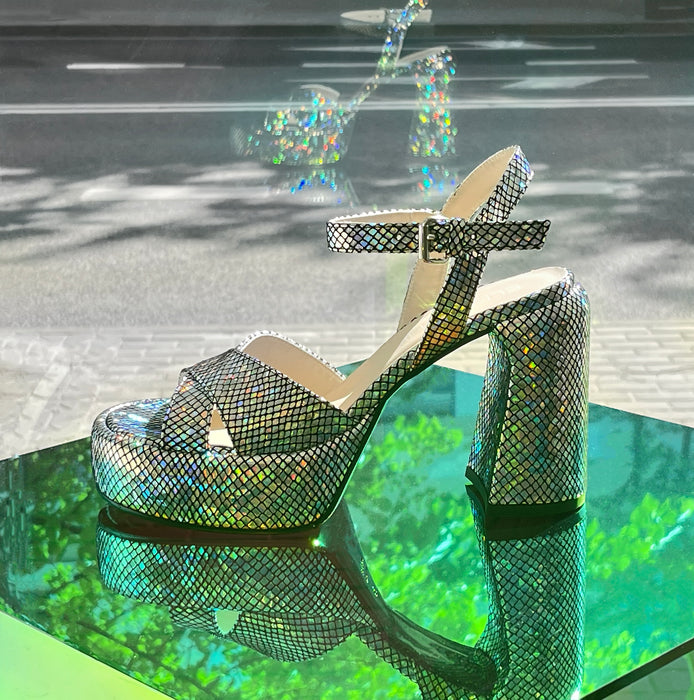 Viršus - holografinio blizgesio oda. Užsegimas sagtele.