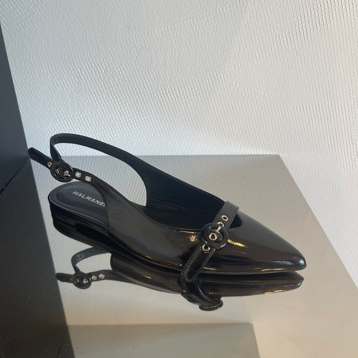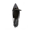 Viršus - blizgi oda. Įsiaunami. Užsegimas sagtele. Juodos spalvos.