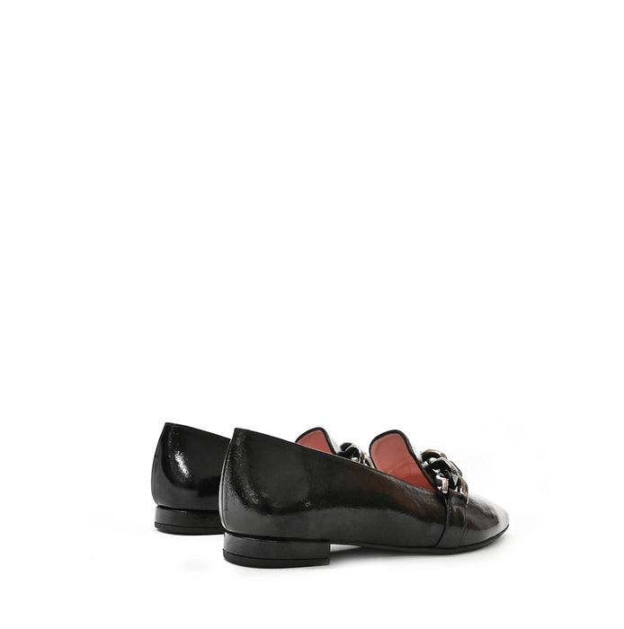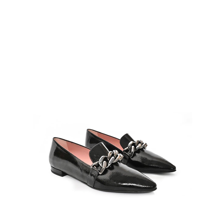 Viršus - minkšta lakuota oda. Metalinė dekoratyvi grandinėlė.