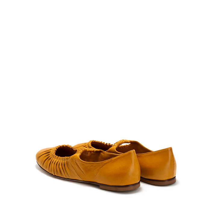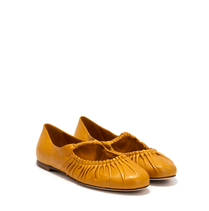 Viršus - itin minkšta oda. Įsiaunami. Geltonos-garstyčių spalvos.