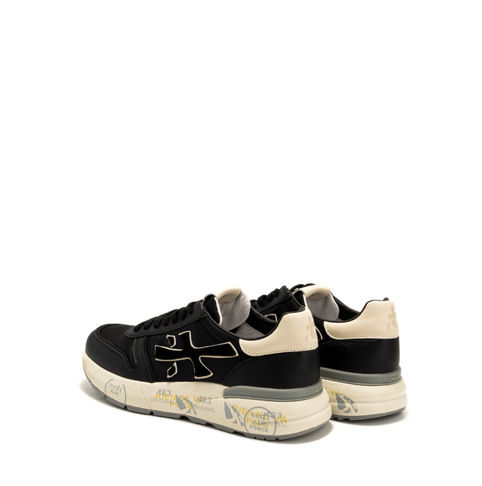 Juodos spalvos sportinio tipo bateliai. Odos ir techninės tekstilės derinys. Suvarstomi. Viduje - oda. Padas - guma. Importuota.