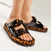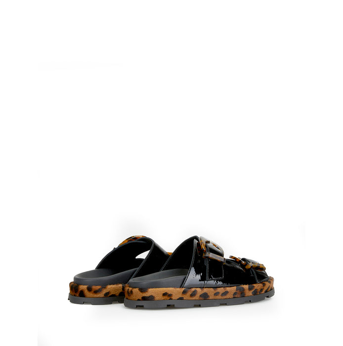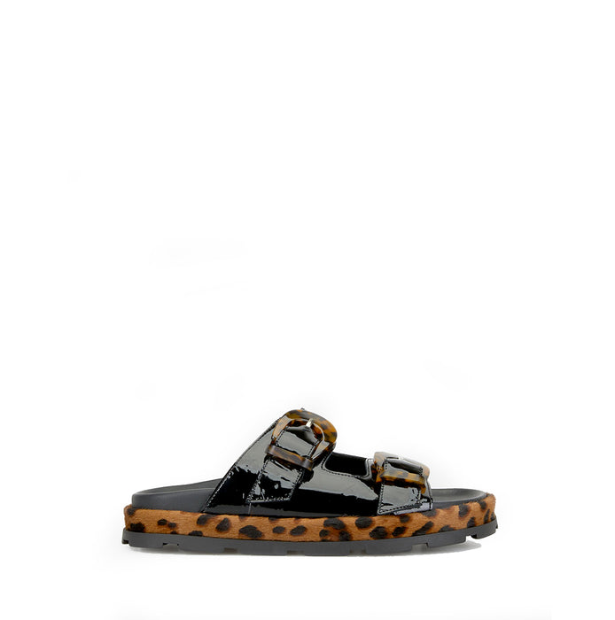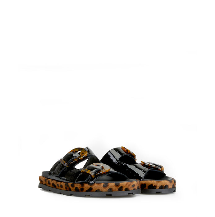 Viršus - lakuota oda. Dekoratyvios kailio detalės. Užsegimai sagtelėmis.