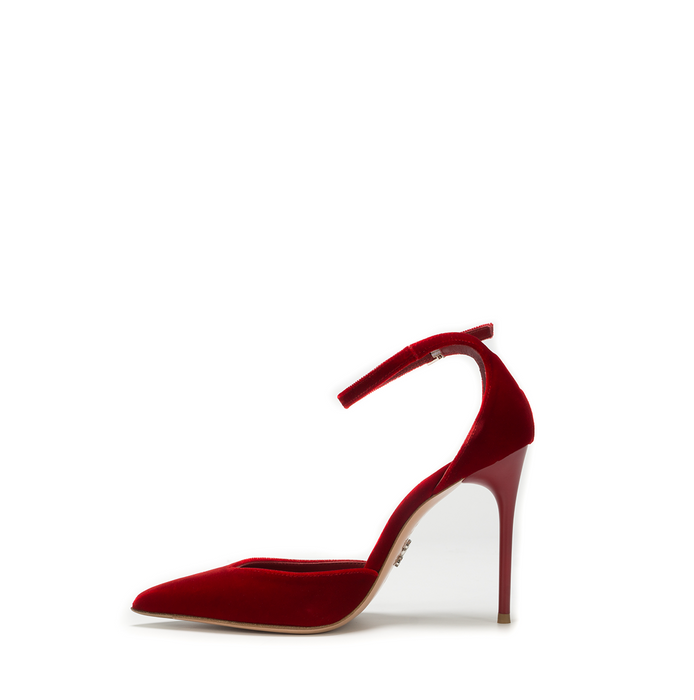 Velour pumps in red from Sergio Levantesi. A pointy toe, buckle closure. Stiletto heel. Leather lining, leather sole.