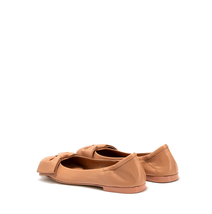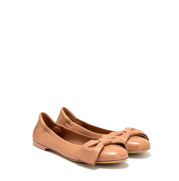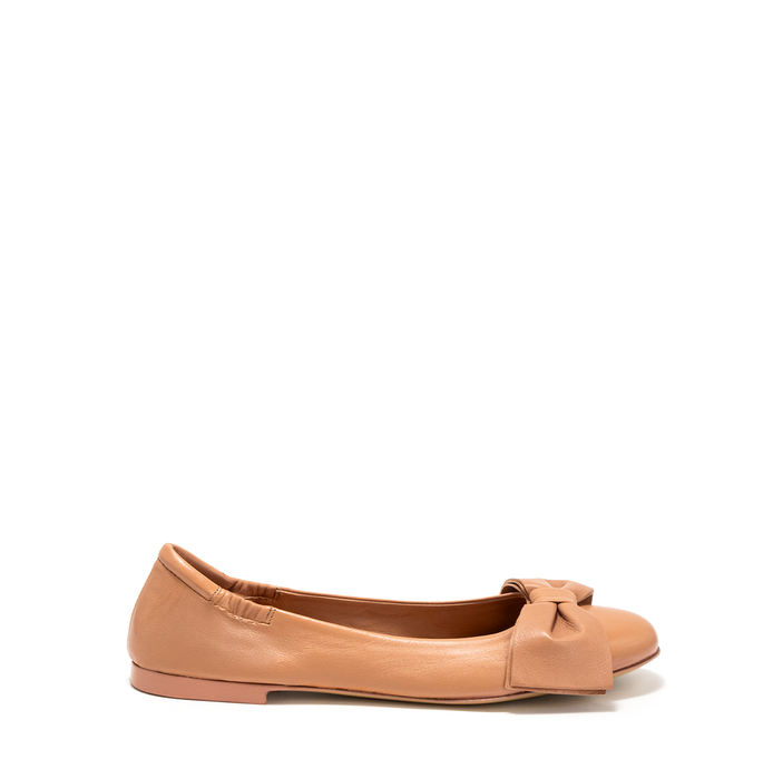 Extra soft leather ballerinas in sandy rose tone from Pomme D'Or. A round-toe, slip-on design. Bow detail. “Sacchetto” construction. "Sacchetto" creates light and ultra-flexible shoes that adapt to the movement and curvature of the feet. Leather lining, leather/rubber sole.