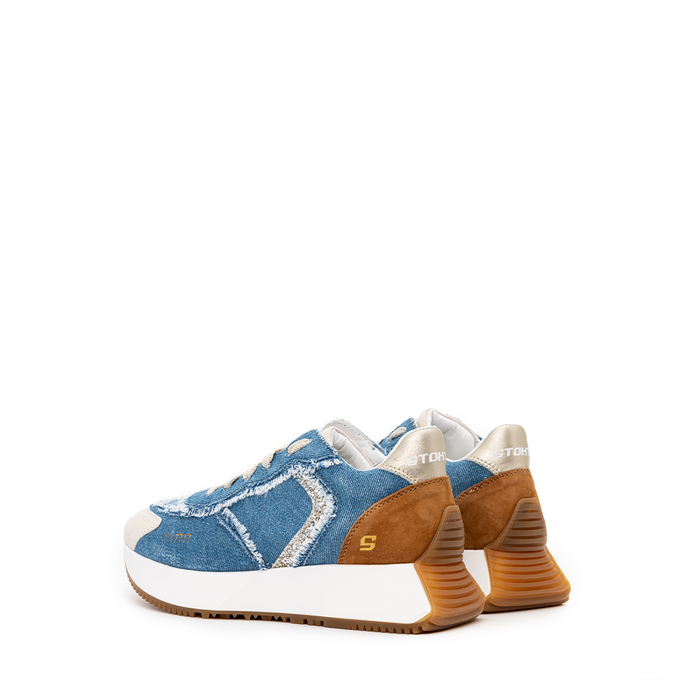 Denim sneakers with brown suede detail from Stokton. A round toe, lace-up closure. Please note that these boots are finished with a unique washing technique making each pair different and exclusive. Logo embossed. Leather lining. Rubber sole.