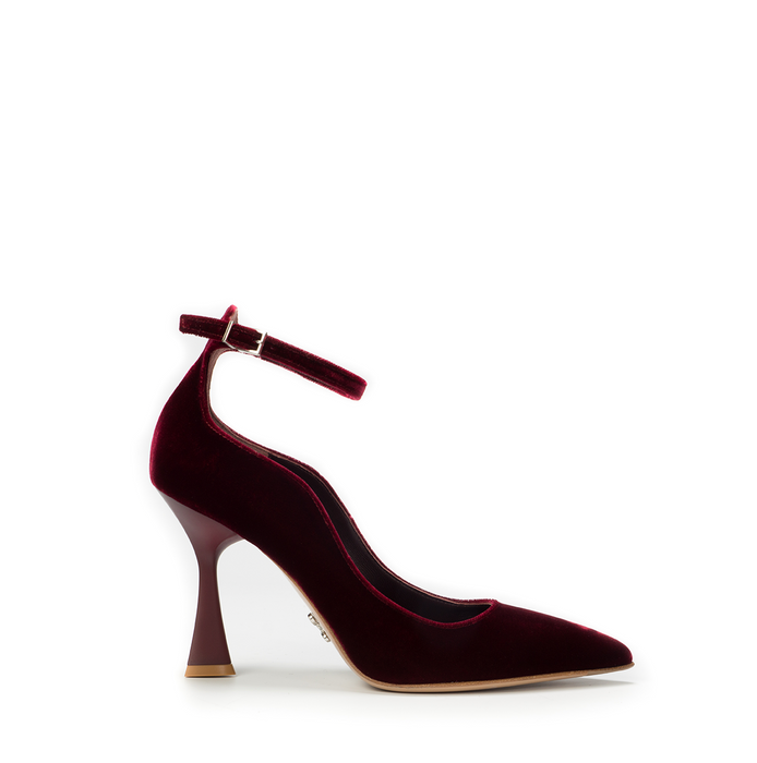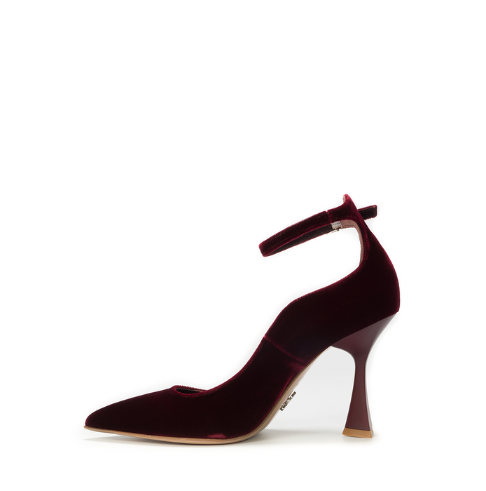 Velour pumps in dark red from Sergio Levantesi. A pointy toe, buckle closure. Geometric form heel. Leather lining, leather sole.