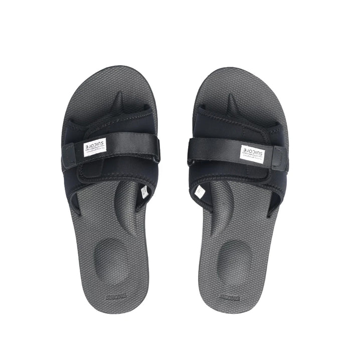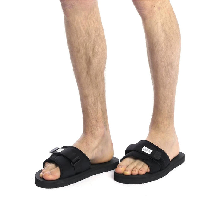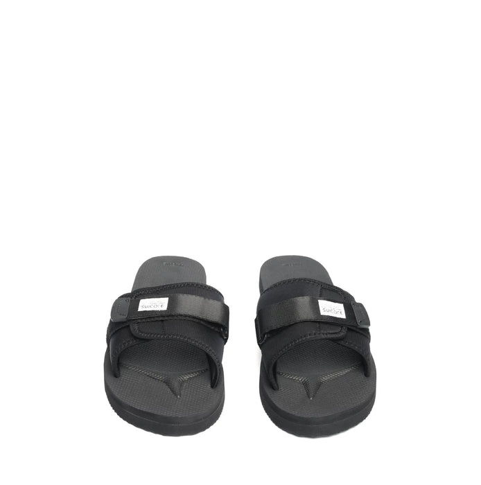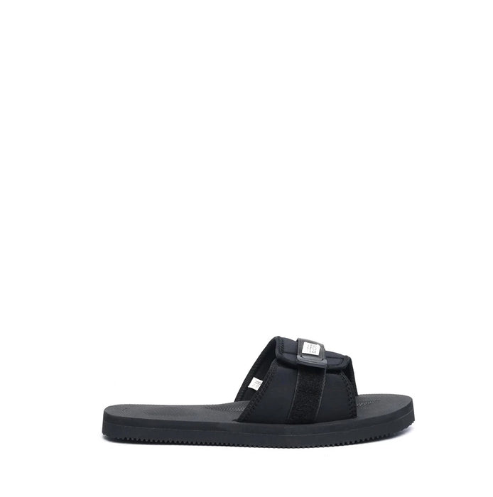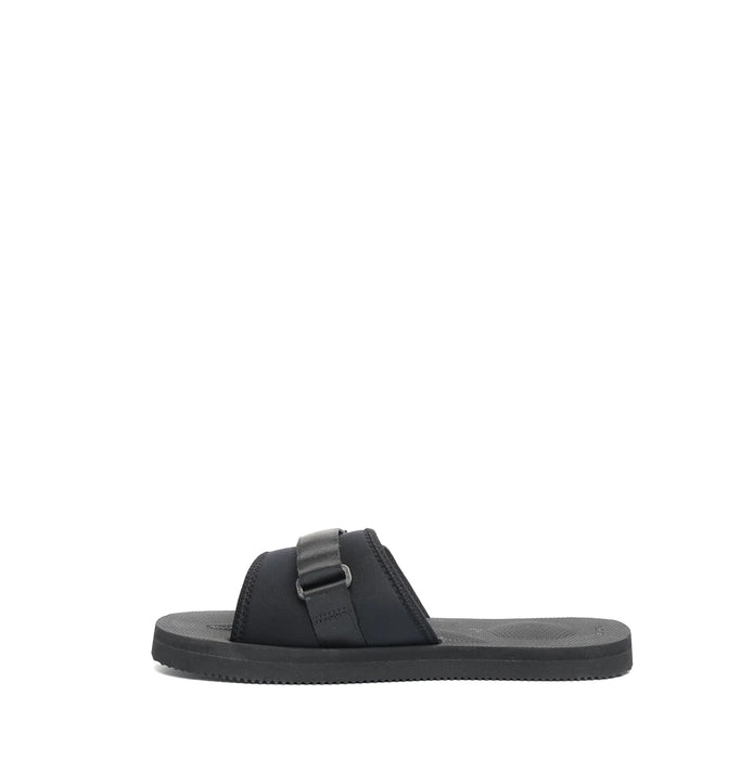 Black neoprene and textile slipper from Japanese brand Suicoke . A round open toe sandals. The Padri sandals feature adjustable strap, a nylon and synthetic fiber upper shell. EVA footbed and rubber sole. Unique Suicoke footbed and sole composition are created based on specific performance needs: hardness, abrasion resistance, grip, elasticity, density. Suicoke sandals are unisex.