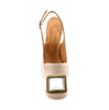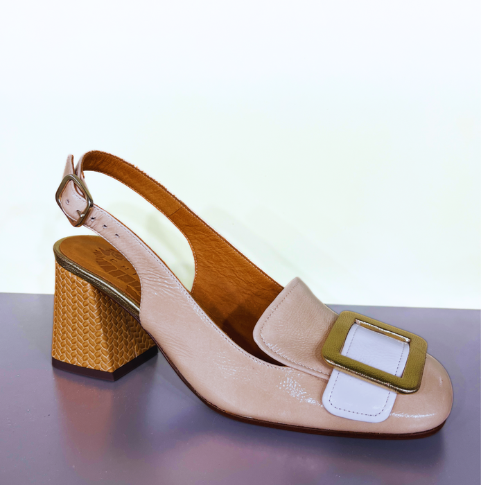 Patent leather slingback pumps in beige with white detail from Chie Mihara. A round-curved toe, slip-on design, buckle closure. Leather-covered block heel. Extra soft leather lining, leather sole with an anti-slippery rubber piece on the bottom.