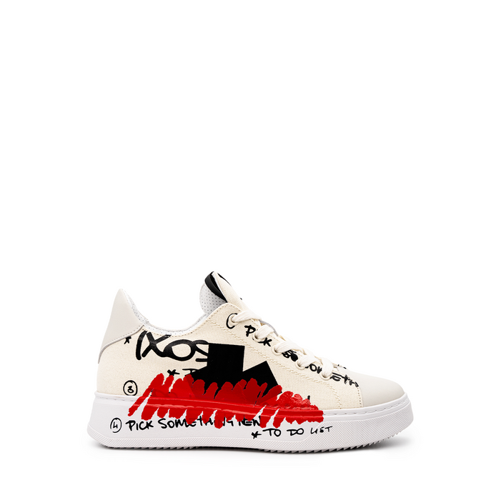 Beige leather and textile sneakers from Ixos X. A round toe, lace-up closure. Painted textile and smooth leather. Leather and textile lining. Rubber sole.