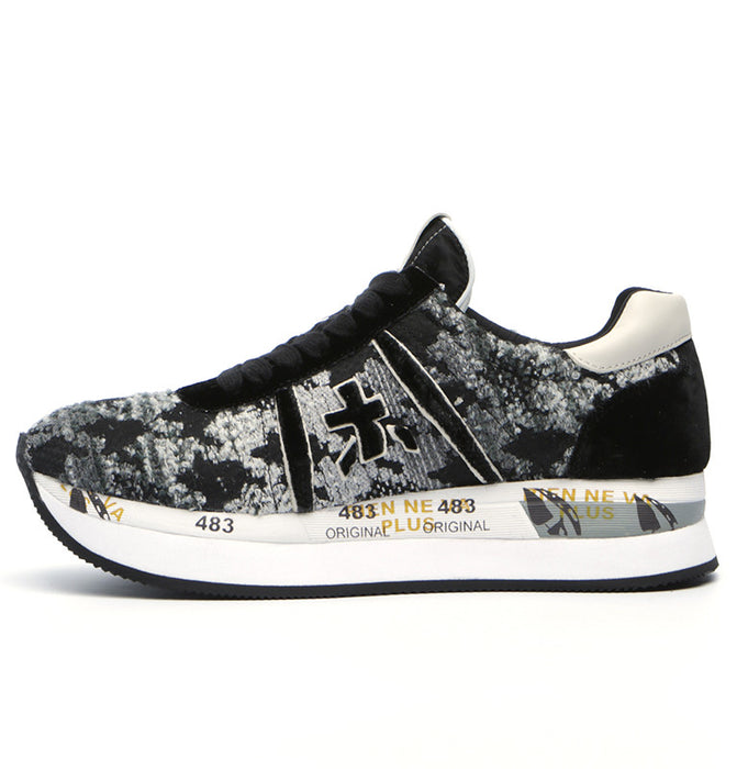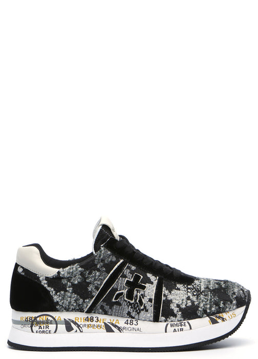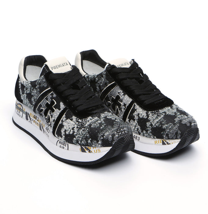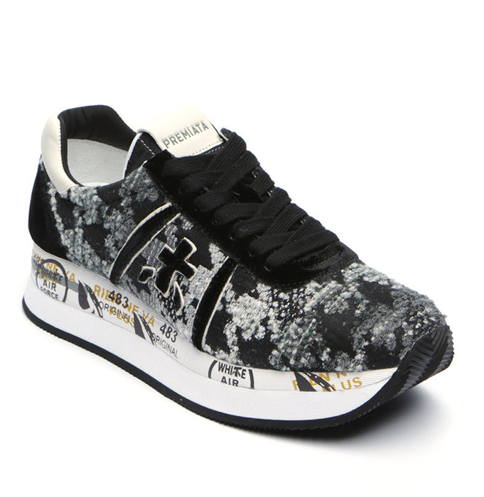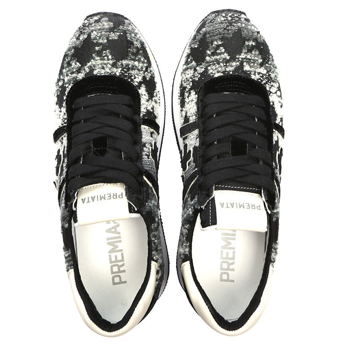 Velour and tweed facture double platform sneaker from Premiata Sneakers. A round classic sneaker toe, cotton lace up closure. Mix of velour and textile. Double platform. Contrast and printed texture rubber sole. Leather insole. Luxury comfort. Dual-density rubber outsole. Logo print at front. Patented model.