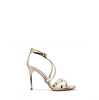 Shiny leather sandals in golden tone from Sergio Levantesi. Leather strips criss-cross at the front. An open-toe, buckle closure. Stiletto heel. Leather lining, leather sole.