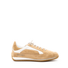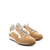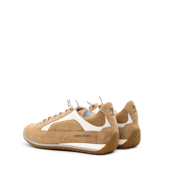 Suede sneakers in cappuccino tones with white details from Candice Cooper. A round toe, lace-up closure. Leather lining. Rubber sole with profile that goes up the heel.