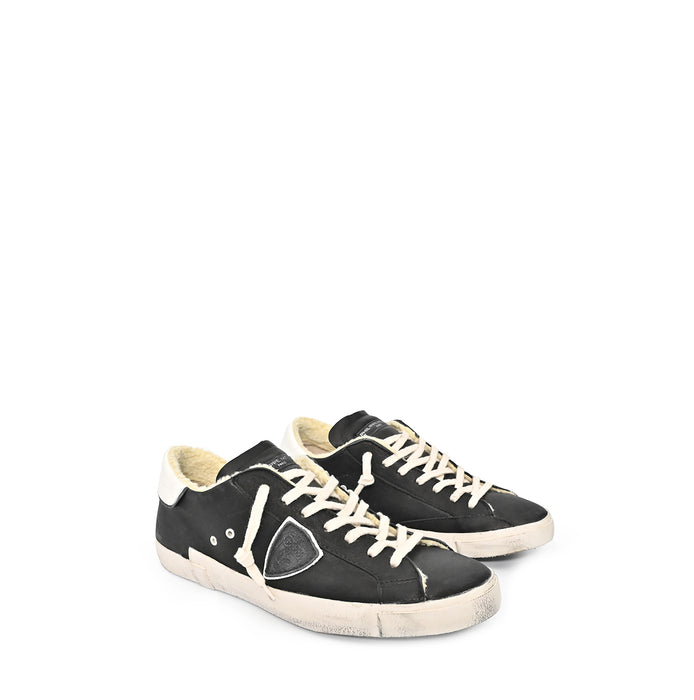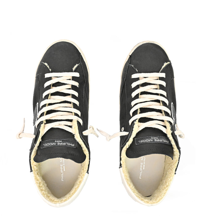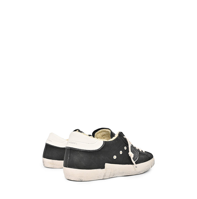 Vulcanized construction fur-lined sneakers from Philippe Model. A round toe, lace-up closure. Signature worn look rubber sole. Fur/leather lining. Leather inner sole.