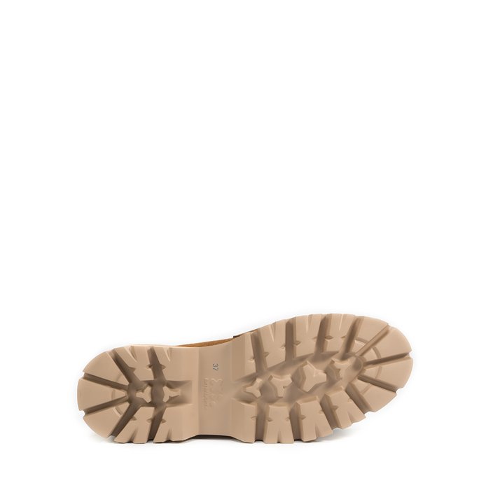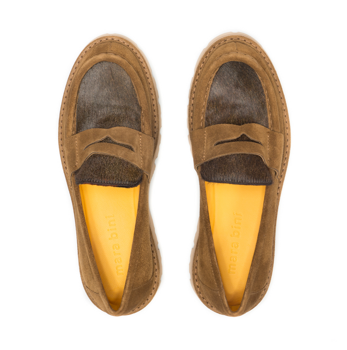 Suede loafers in brown tones from Mara Bini. A round-curved toe. Decorative fur detail. Leather lining. Extra-light rubber sole.