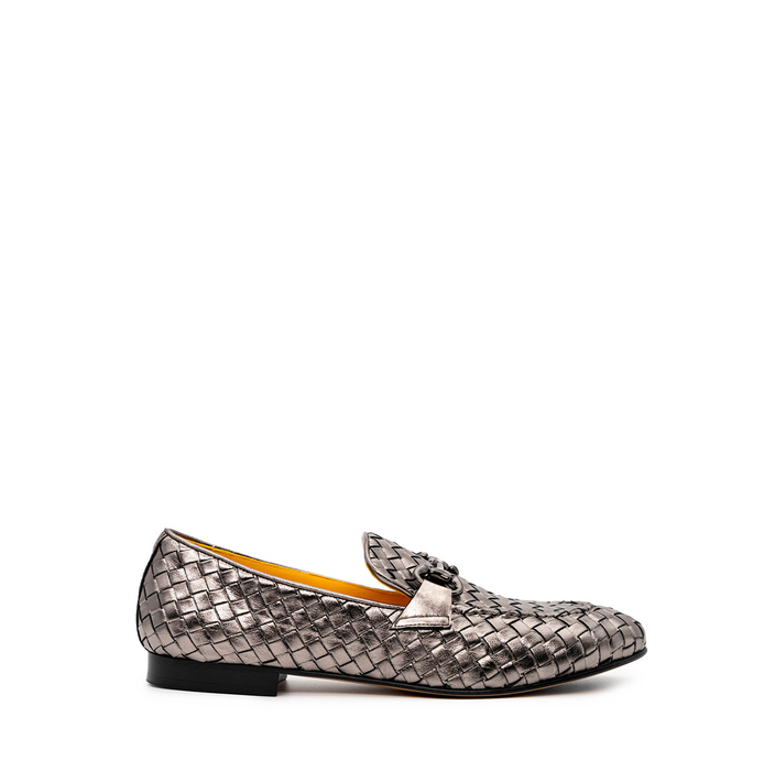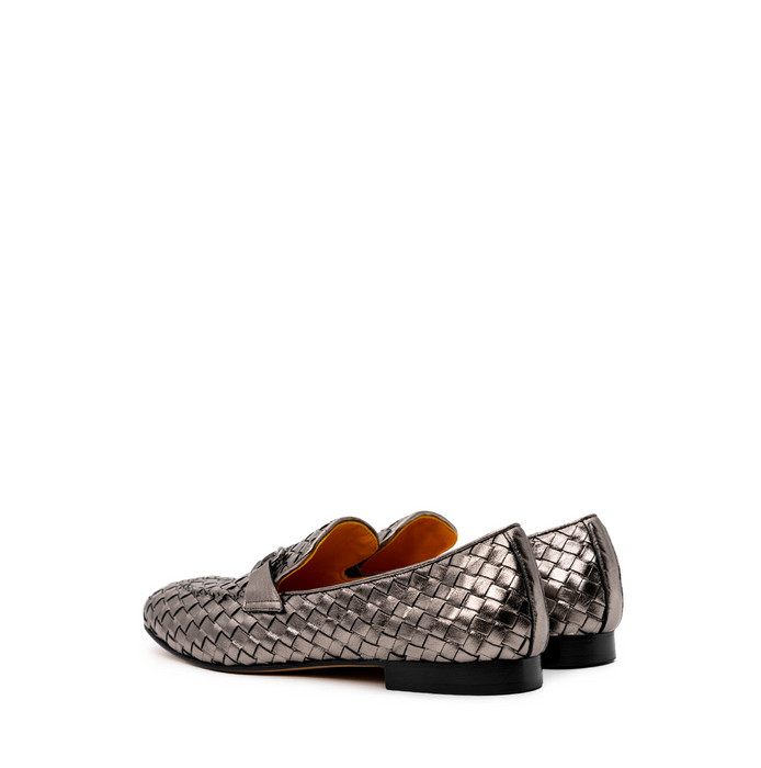 Woven leather loafers in metallic tone with decorative embellishment from Mara Bini. A round-toe, slip-on design. Leather lining. Leather/rubber sole.