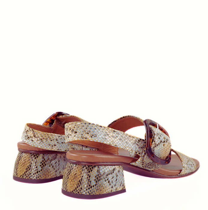 These soft snake-print leather sandals from Chie Mihara feature a round toe, slip-on design, and buckle closure. They also have a leather-covered heel, extra-soft leather lining, and a leather sole with an anti-slippery rubber piece on the bottom.