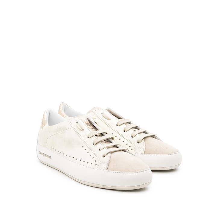 Glitter leather sneakers with suede in ivory tones from Candice Cooper. A round toe, lace-up closure. Please note that these leather shoes are finished with a unique washing technique, making each pair different and exclusive. Thin rubber sole that rises at the heel.