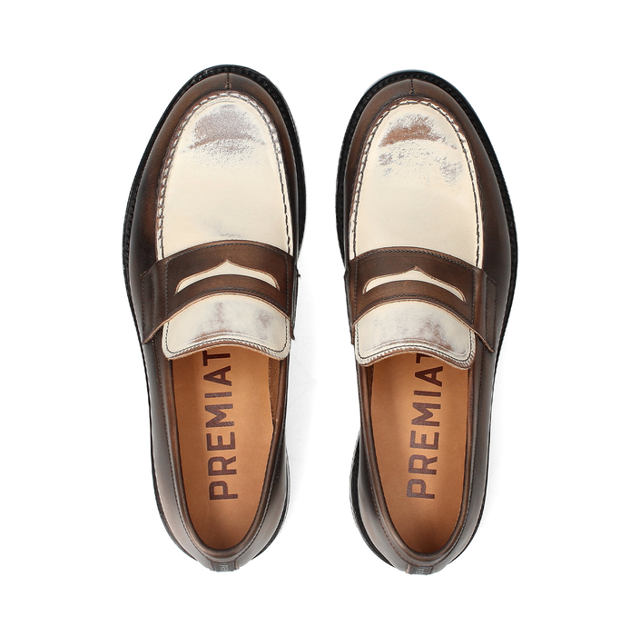 Leather loafers in brown and white tones from Premiata. A round-toe, slip-on design. These leather loafers are finished with a unique washing technique, making each pair unique and exclusive. Leather lining, leather/rubber sole. The mix of intense research and high-tech design with a classic and traditional method.