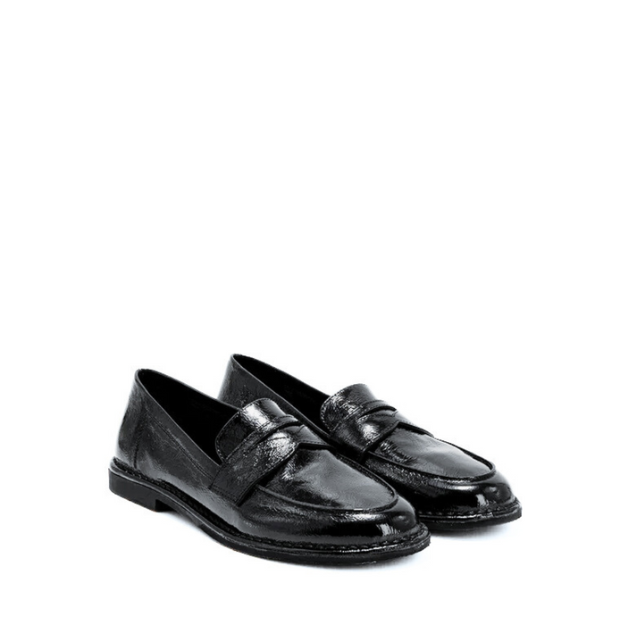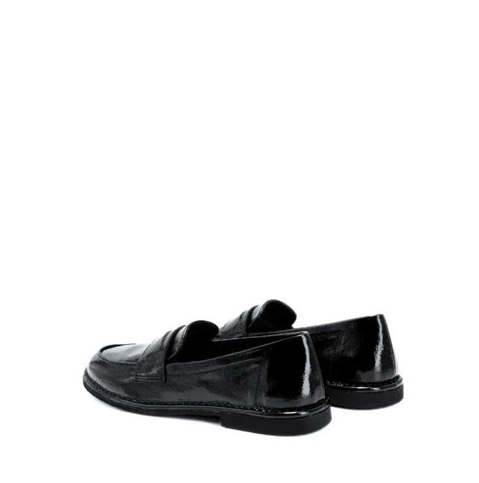 Glossy leather loafers in black tone from Mara Bini. Unique wrinkled texture. A round-toe, slip-on design. Leather lining. Rubber sole.