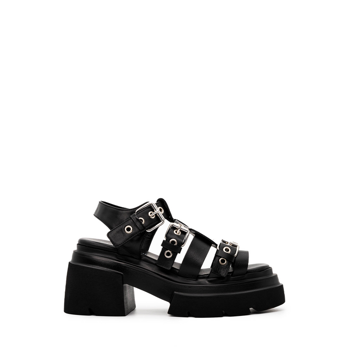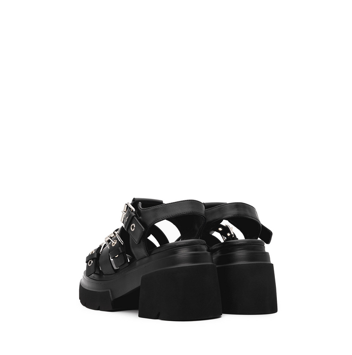 Leather sandals in black from Elena Iachi. Many strings cover the foot leaving uncovered the toe and heel. A round toe, buckle closure. Leather lining. Lightweight rubber sole.