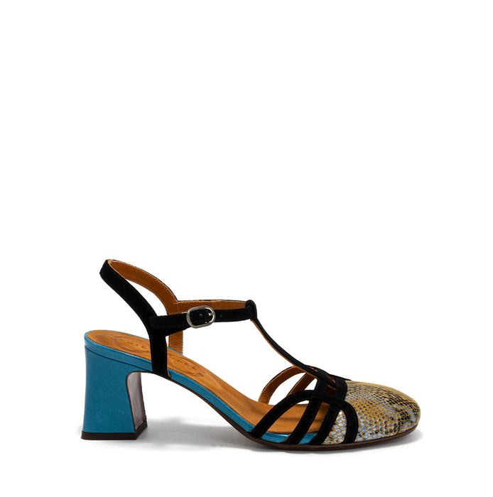 Leather pumps in black tone with snake print leather detail from Chie Mihara. A round toe, buckle closure. Leather-covered blue heel. Extra soft leather lining, leather sole with an anti-slippery rubber piece on the bottom.