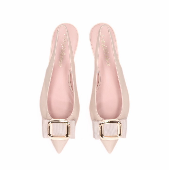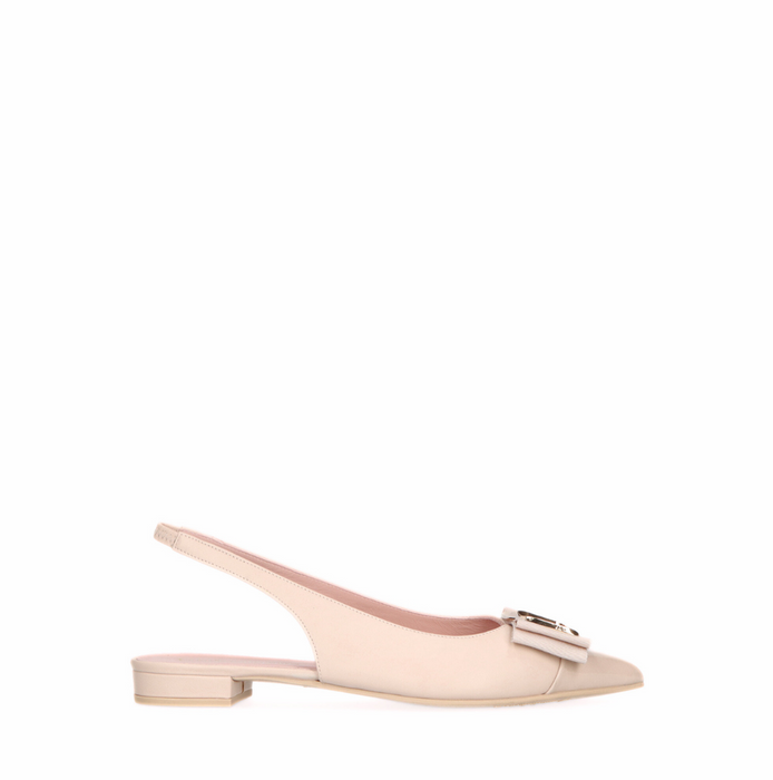 Leather loafers in nude tones from Pretty Ballerinas. A pointy patent leather toe, slip-on design. Bow detail. Open heel. Leather lining. Rubber sole.
