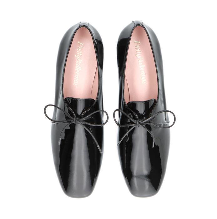 Patent leather lace-up shoes in black from Pretty Ballerinas. A round-toe, lace-up closure. Rubber sole. Leather lining.