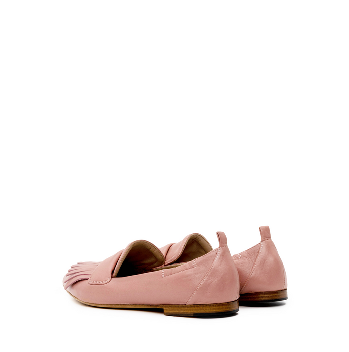 Extra soft leather loafers in pale pink from Pomme d'Or. A pointy toe, slip-on design. Fringe detail. “Sacchetto” construction. "Sacchetto" creates light and ultra-flexible shoes that adapt to the movement and curvature of the feet. Leather lining, leather/rubber sole.